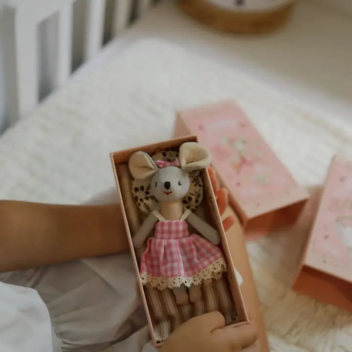 Mouse Lulu is the cutest thing ever. She is wearing a little pink dress with classic check pattern and a bow to match, and her tiny ears perked up like she’s always on some adorable adventure.