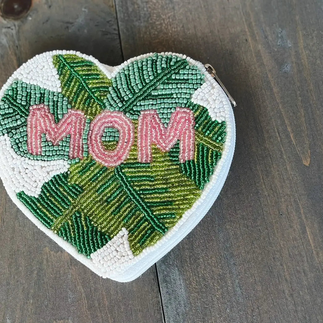 Mom Palm Heart Seed Beaded Coin Pouch Purse Makeup Bag Pouch Size : 3.5" X 5" Zipper Top